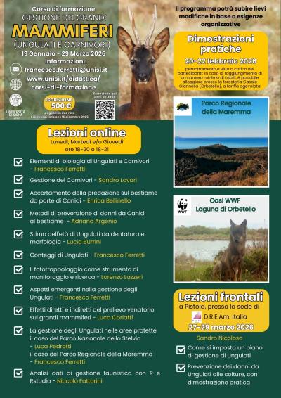 Le lezioni inizieranno il 19 gennaio e finiranno il 29 marzo, online, con due fine settimana in presenza e saranno tenute da docenti e esperti di ecologia, gestione e conservazione dei grandi mammiferi.
