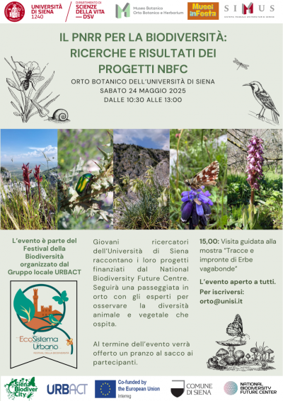 Sabato 24 maggio, dalle 10:30 alle 13:00, l’Orto Botanico dell’Università di Siena ospita l’evento: PNRR per la biodiversità: ricerche e risultati dei progetti NBFC, una mattinata dedicata alla condivisione delle attività di ricerca condotte nell’ambito del National Biodiversity Future Centre.